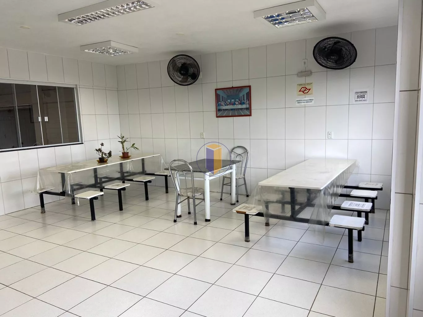 No primeiro andar, há um refeitório que inclui uma sala de TV, uma sala com banheiro e um mezanino.