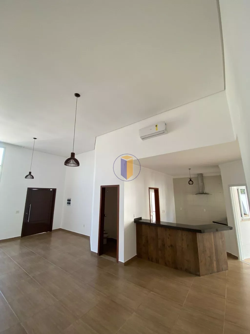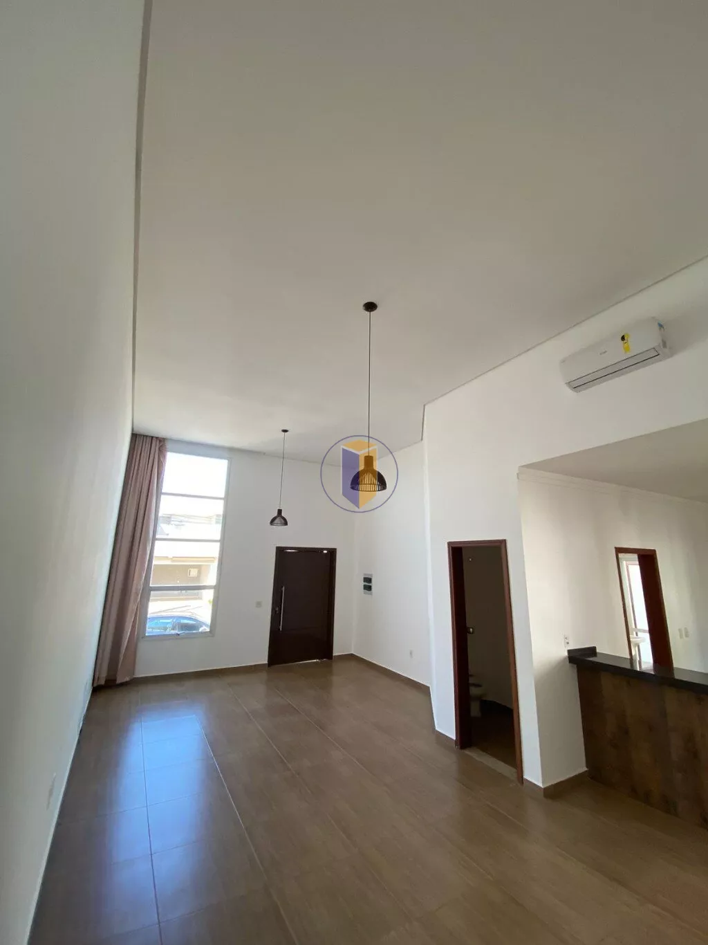 - Sala dois ambientes com pé direito alto.