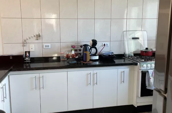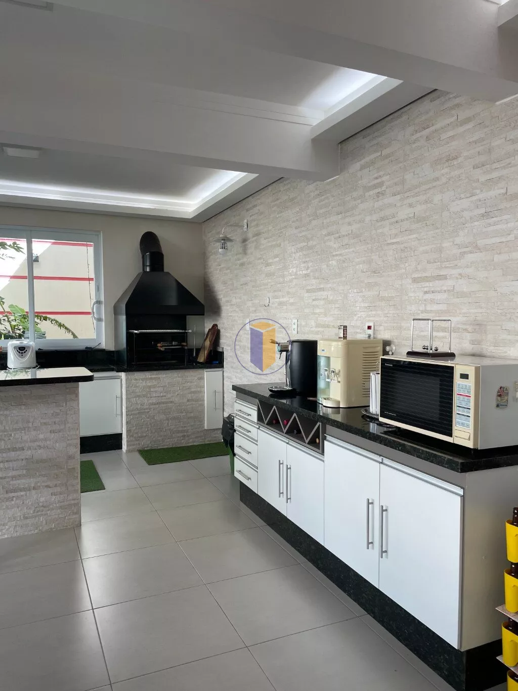 Cozinha americana, com armários e balcão, quintal,