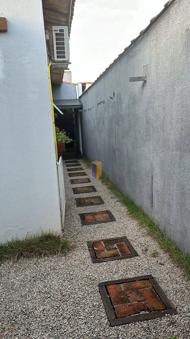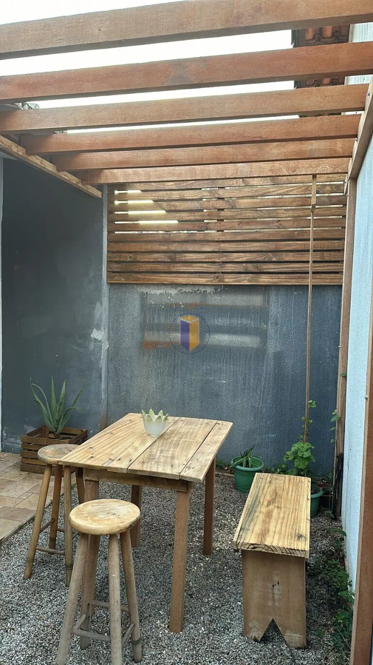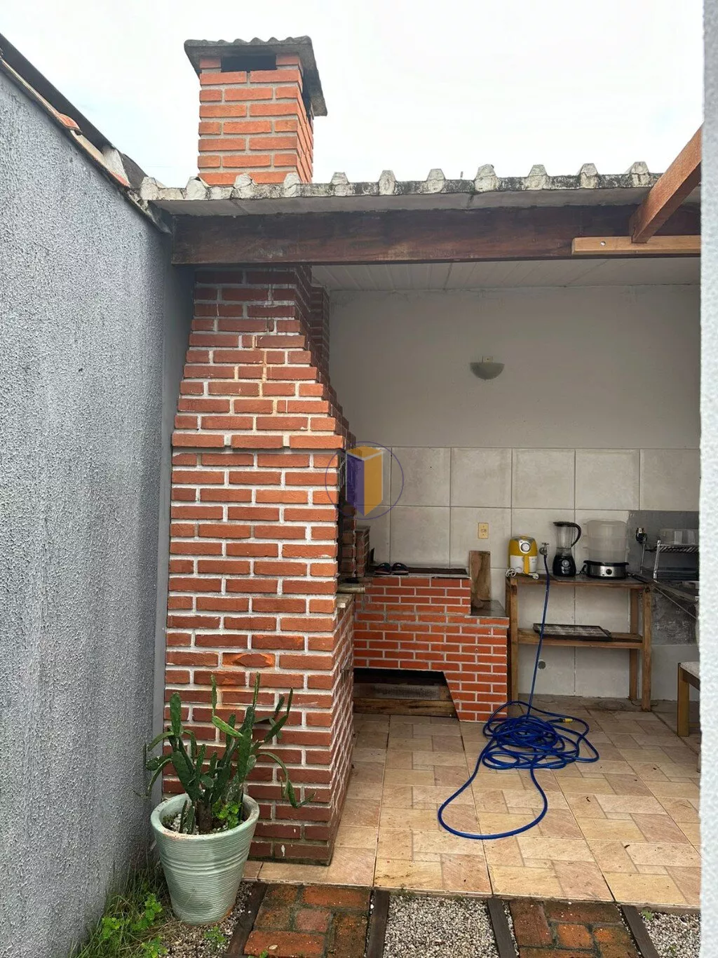 Quintal com pergolado, churrasqueira, fogão a lenha, cozinha e um quartinho de dispensa.