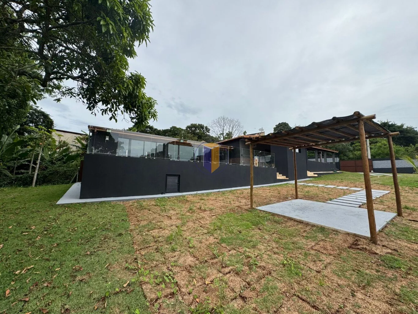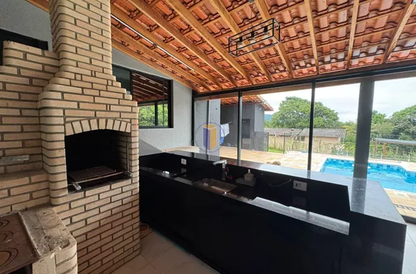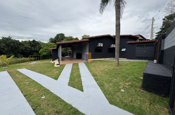 Chácara com acabamentos em preto e cinza de auto luxo e bom gosto.