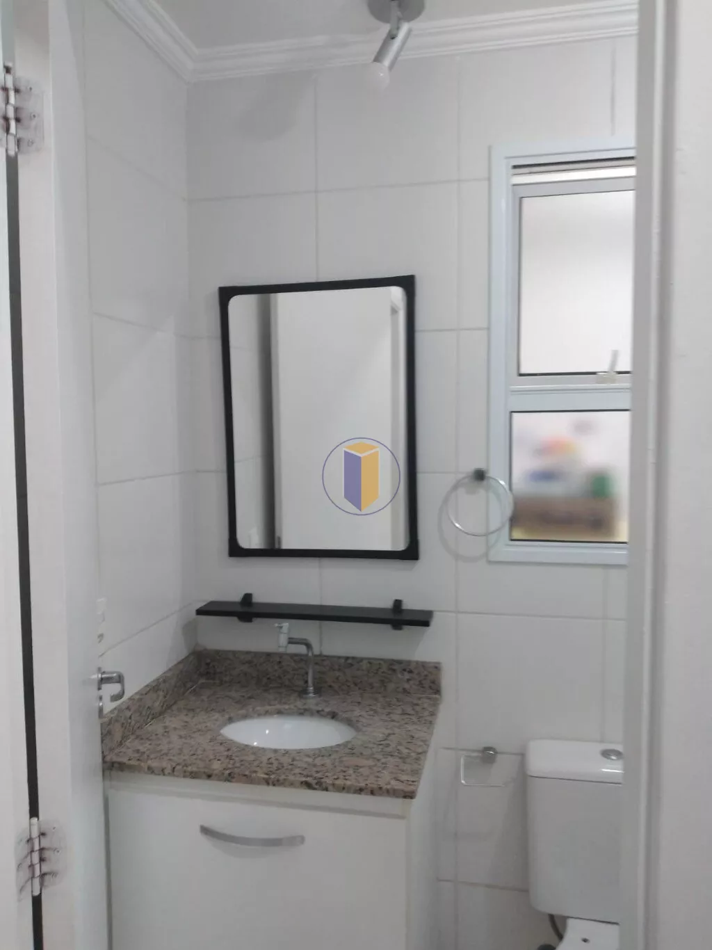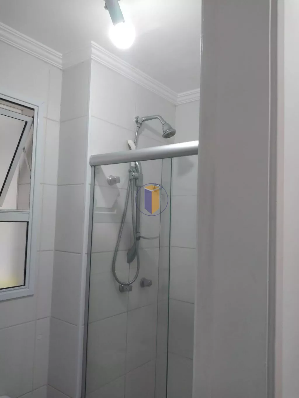 Banheiro com armário e box em vidro temperado;