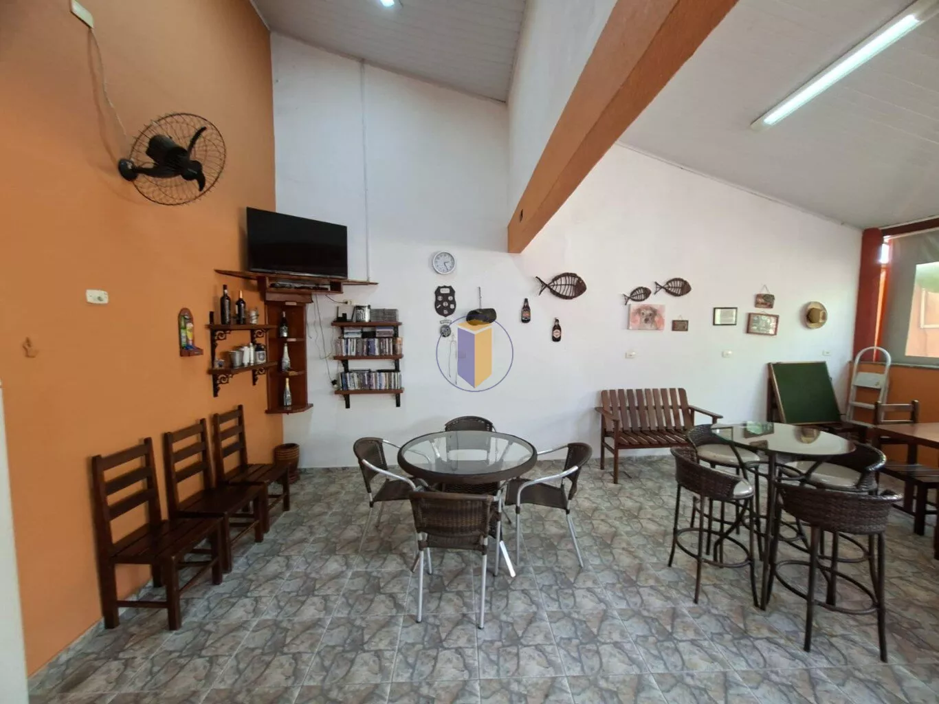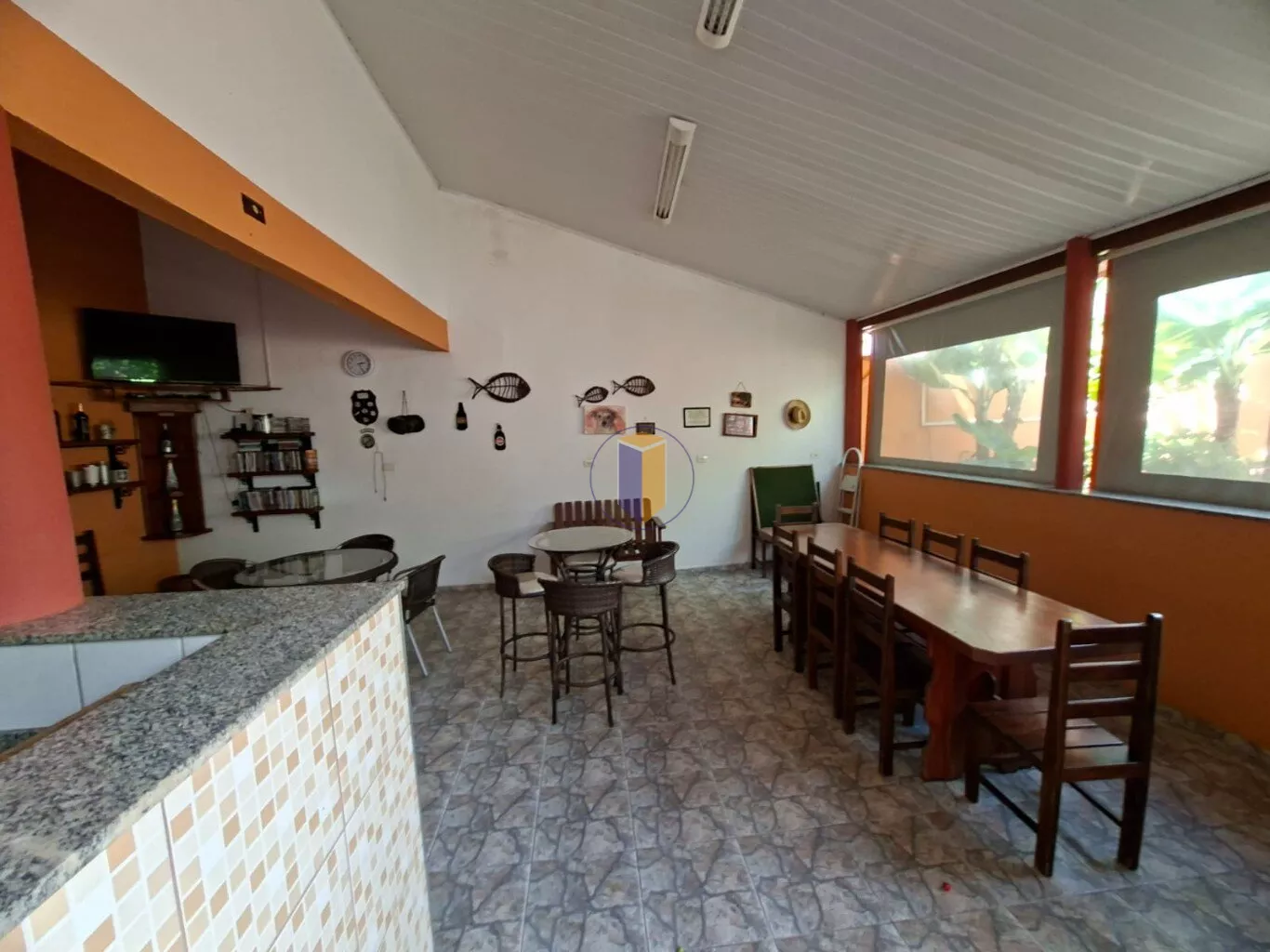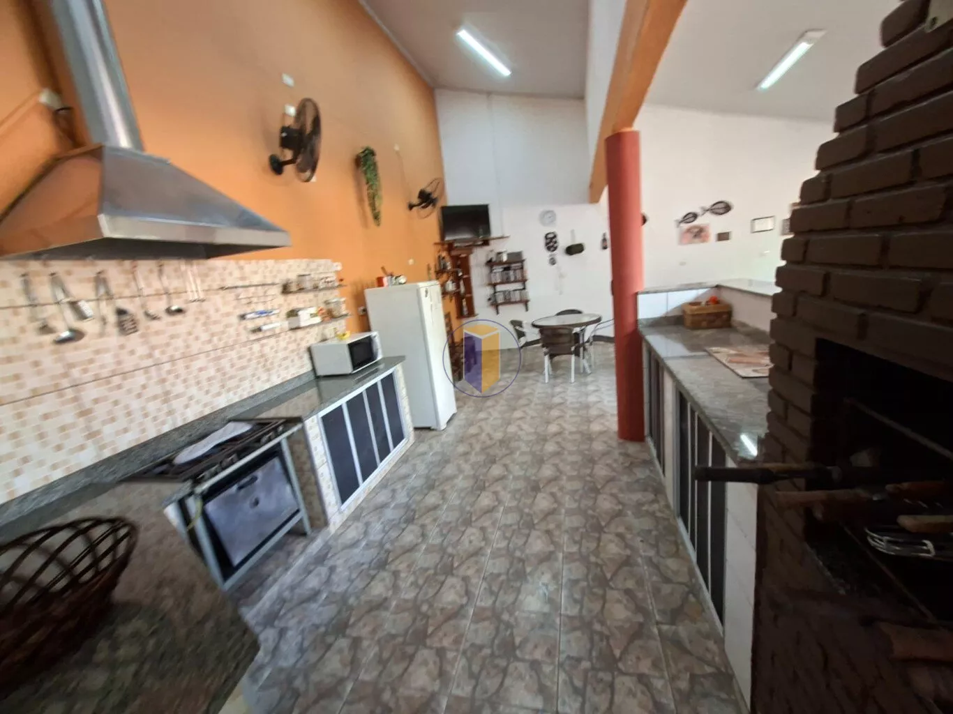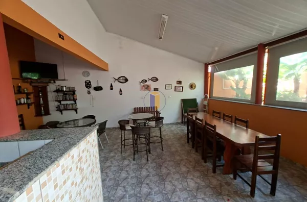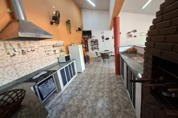 Salão de festas / espaço gourmet com churrasqueira, uma pia grande, 2 balcões, fogão com coifa e área para TV e jogos